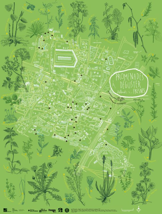 Issue d’un travail de repérage mené sur le terrain en collaboration avec des guides-natures et l’équipe des Promenades à déguster de la compagnie KMK, la carte est à la fois un outil de découverte, de transmission et de sensibilisation. Elle invite à reconnaître les plantes qui poussent à proximité de chez soi, à comprendre leurs usages possibles et à questionner la place accordée au vivant dans l’espace urbain.